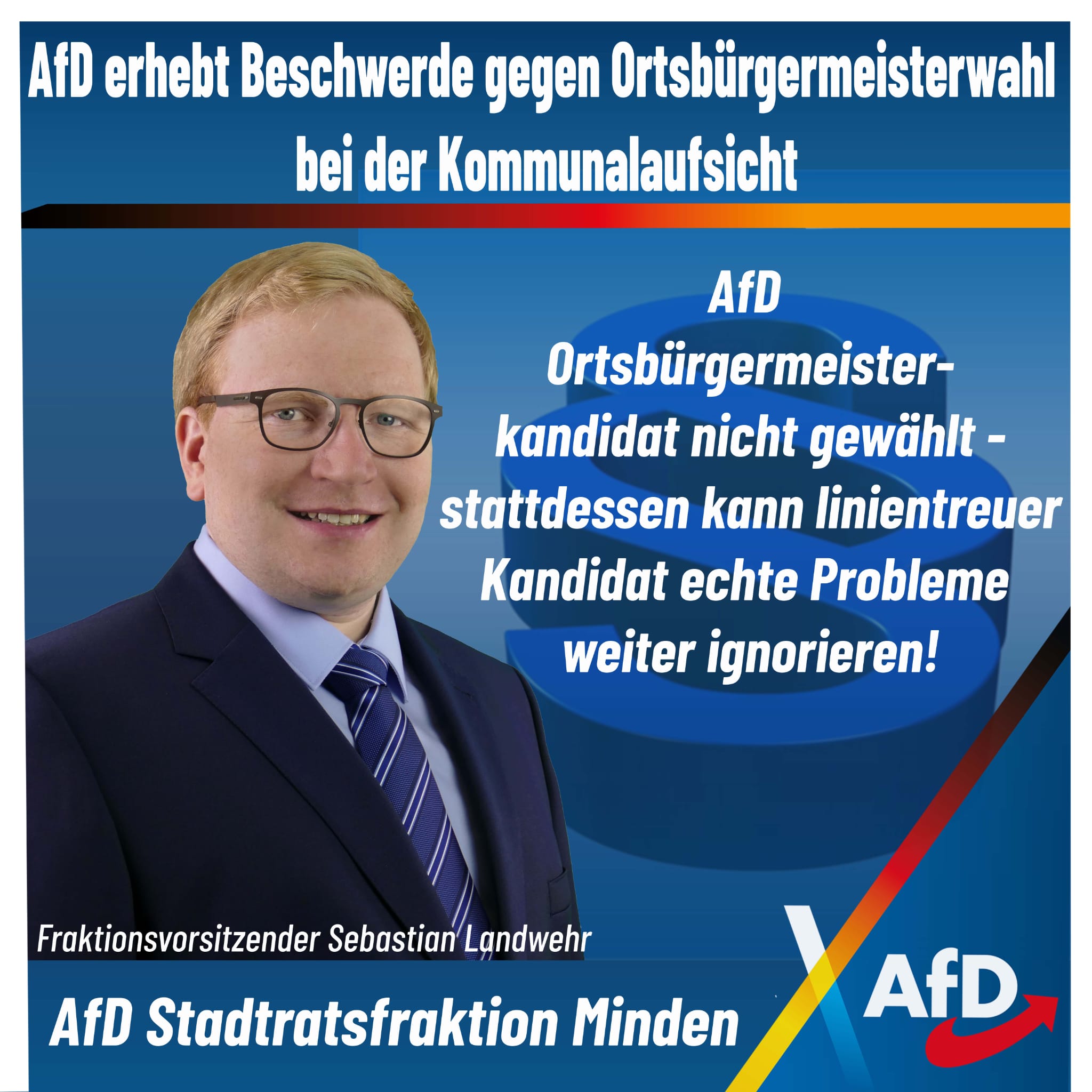 In der Stadtverordnetenversammlung in Minden am 12.2.2026 wurde der Kandidat von SPD/Grüne/CDU Herr Michael Lücke für den Stadtbezirk ,,Rechtes Weserufer“ zum Ortsbürgermeister gewählt. Dagegen erhebt die AfD Stadtratsfraktion Minden Beschwerde bei der Kommunalaufsicht und rügt [...]