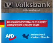 Die Volksbank in Ostwestfalen hat das Konto des AfD-Kreisverbands Minden-Lübbecke ohne Anführung von Gründen gekündigt. An der reinen Geschäftsbeziehung kann dies nicht liegen, denn über 10 Jahre war der AfD Kreisverband Minden-Lübbecke ein verlässlicher und [...]